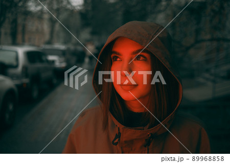 Young happy woman wearing raincoat is feeling free and smiling under the rain. red light