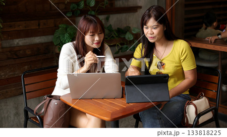 Two Asian Women Working Together with Laptop and Tablet in Cafe