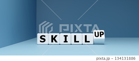 Skill Up and Professional Development Concept with Letter Blocks on Blue Background