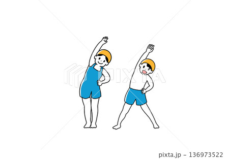 兒童身穿泳衣進行游泳熱身運動的插圖,泳池場景,手繪向量素材