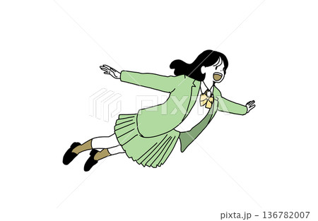 女學生在空中飛翔的插圖。躍向未來,擁抱自由。手繪向量素材。