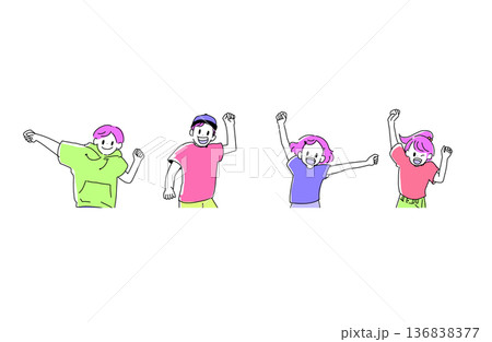 插圖描繪了一群男女學生面帶笑容跳躍,並揮舞拳頭慶祝的場景。象徵通過考試和青春活力。手繪向量素材。