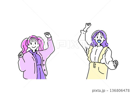 兩位年輕女子揮拳慶祝的插畫。歡呼雀躍,慶祝成功。手繪向量素材。