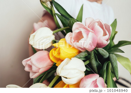 Child boy holds a bouquet of colorful tulips in front of his face.