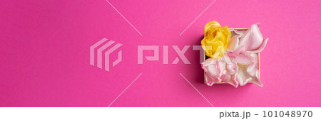 Pink and yellow tulip flowers in a box on a pink background