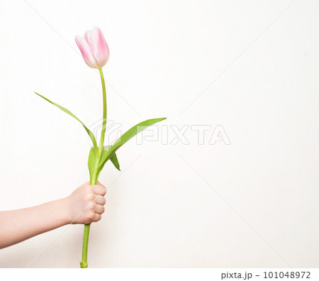 Child's hand holding a beautiful tulip flower on a white background