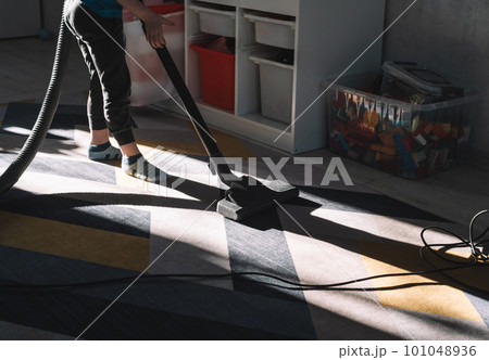Child is vacuuming the carpet. Boy helping with house cleaning