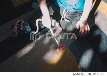 Child turns on the vacuum cleaner to clean the room