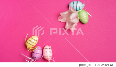Colorful Easter eggs with spring flowers on a pink background. Colored Egg Holiday border.