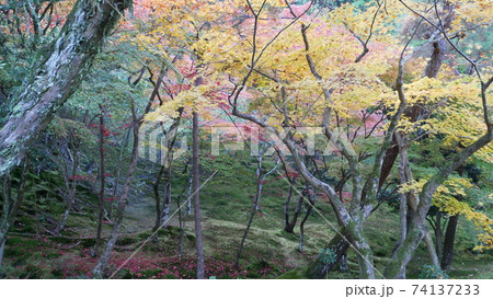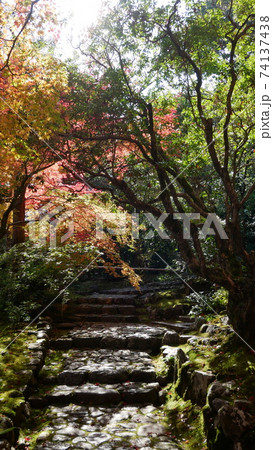 紅槭和黃色地毯照耀在陽光下在一座古廟在秋天在京都