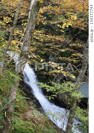 透過黃色樹葉和樹枝的縫隙,可以看到白色的瀑布(豎構圖)