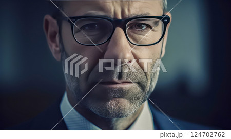 AI-generated content. Business man portrait. 40 year old business man wearing eyeglasses, looking at camera,, cinematic, banner. AI generated