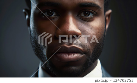 Close-up face of young african american businessman looking at camera, success, earnings, boss. AI Generated.