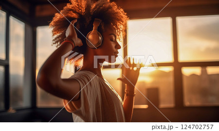 Dancing african american hipster girl wearing wireless headphones on the background of window and sunset in apartment. AI Generated