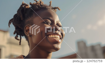 headshot african-American happy woman smiling. Street portrait of strong, confident woman in city at sunset. Golden Hour. Relationship with yourself. Generated by AI