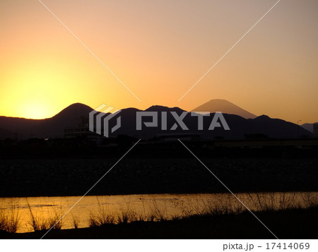 Saku河和富士山美麗的剪影在日落弄髒了