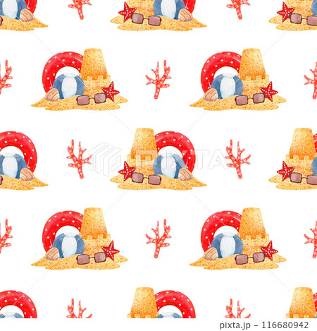 Watercolor seamless pattern with sand castle and inflatable rubber illustration