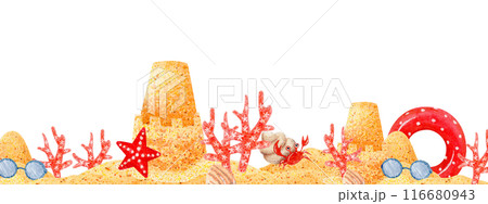 Watercolor horizontal frame with place for text. Sand castle, beach ball, coral on isolated white background