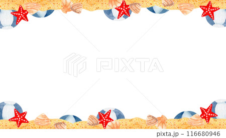 Watercolor horizontal frame with place for text. Beach sand, beach ball on isolated white background