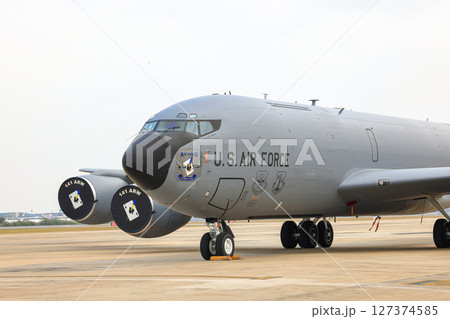 A United States Air Force military aerial refueling tanker Boing KC-130 Stratotanker at the airbase apron.
