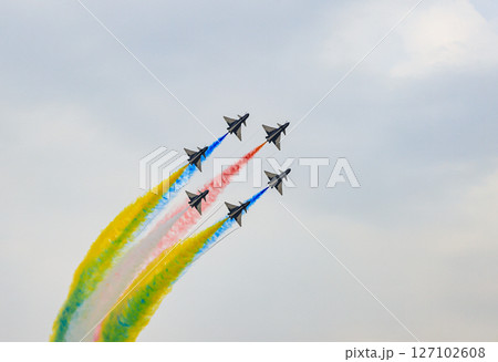 J-10 of China Air Force Aerobatics team on formations with colorful smokes venting from the plane.