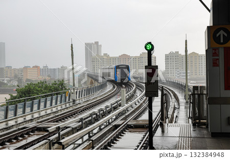 The train approached the platform to take up passengers in rainstorm.