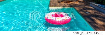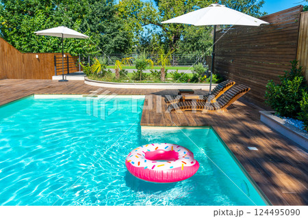 Pink donut inflatable float in turquoise swimming pool with wooden deck and sunny highlights