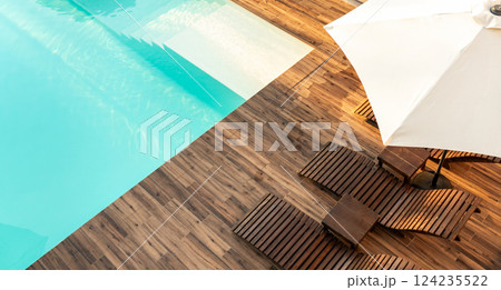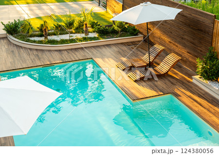 Luxury poolside wooden deck with modern lounge chairs, umbrella, and turquoise swimming pool