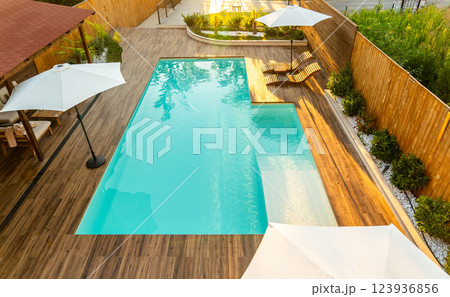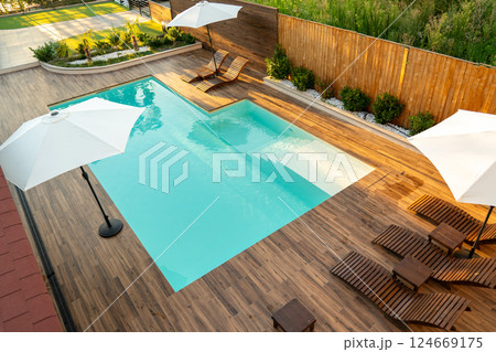 Stylish backyard with turquoise swimming pool, wooden deck, lounge chairs, and white umbrellas