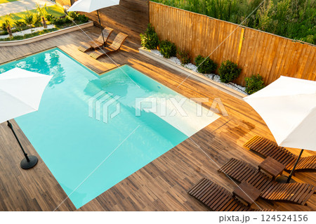 Elegant backyard with turquoise swimming pool, wooden deck, umbrellas, and lounge chairs in a sunny setting