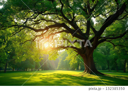 Majestic Oak Tree in Morning Sunlight and Green Park Landscape
