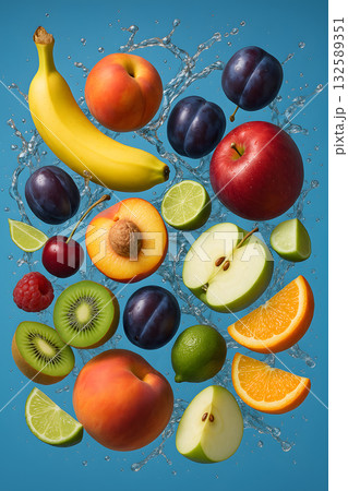 Studio Photograph of Juicy Assorted Fruits in Motion with Blue Background Water Splashes High Contrast Saturation and Clean Composition