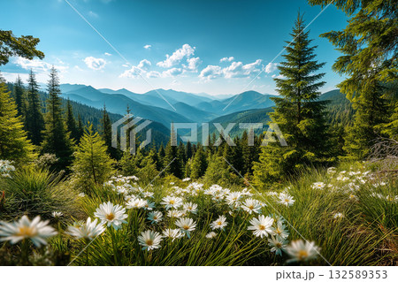 Scenic mountain valley with blooming daisies, evergreen forest and sunlit hills under a clear blue sky in summer nature panorama, horizontal orientation with copy space
