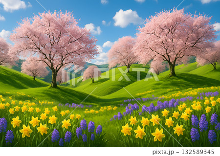 Picturesque Spring Landscape with Blooming Cherry Blossoms, Rolling Green Hills, and Colorful Field of Daffodils and Hyacinths under Bright Blue Sky