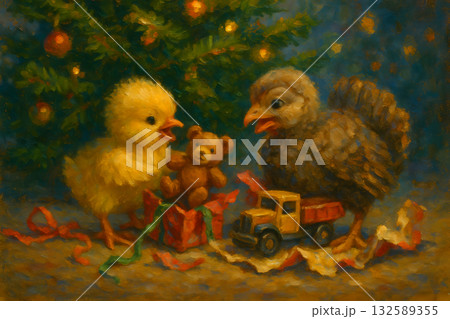 Impressionist Christmas Card of One Chick and One Poult Inspecting Presents by a Decorated Tree, Painterly Holiday Scene with Warm Glow