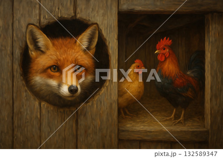 Whimsical Predator Versus Prey Moment: Fox Framed in Circular Hole Observes Chickens on Straw in Cozy Rural Setting for Storytelling Use