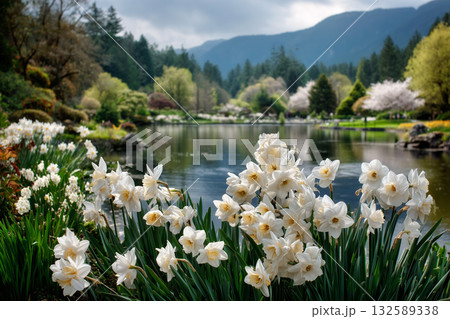 Serene Spring Garden with White Daffodils in Foreground by a Calm Lake Surrounded by Blooming Trees Hills and Mountains Under a Cloudy Sky, Picturesque Seasonal Landscape Scene