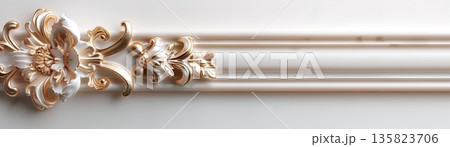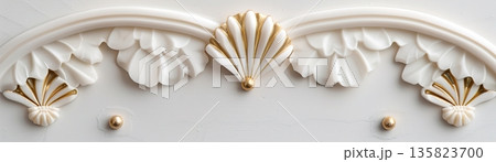 Refined header strip showcases intricate deco gold pattern, featuring detailed shell motifs against a smooth white background. The design enhances a classic and elegant atmosphere