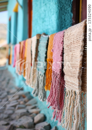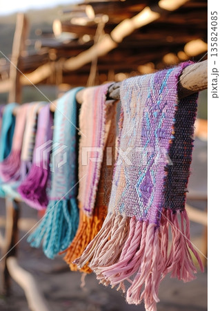 Brightly colored textiles hang on a wooden rack, drying in the sun. This scene captures the heart of local craftsmanship and the beauty of traditional materials