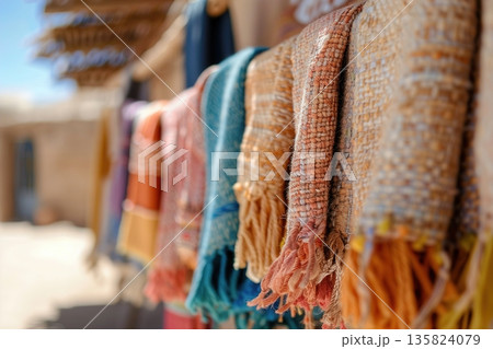 Colorful textiles hang to dry in the warm sun. The local artisans display their crafted fabrics, highlighting the rich hues and textures in a vibrant outdoor setting