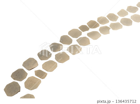 Paving stones are placed in a curved line on a white background. These stones are shaped like octagons and have a simple design. They can be used in landscaping or decoration