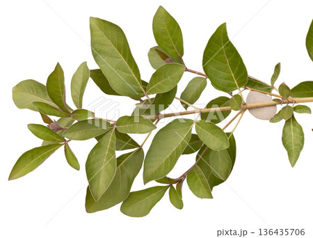 A branch of bright green leaves is displayed against a white background. The leaves have a smooth surface and vary in size and shape. This branch shows the vibrant colors found in nature