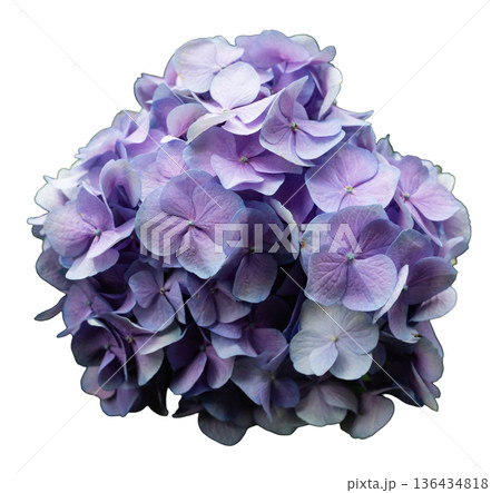 Cluster of blue hydrangea flowers is cut out and placed on a white background. The arrangement displays beautiful blue petals in various shades
