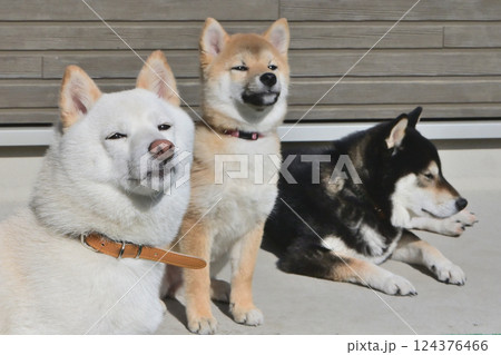三隻不同顏色的柴犬曬日光浴