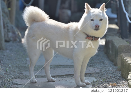 白色柴犬站在花園的墊腳石上