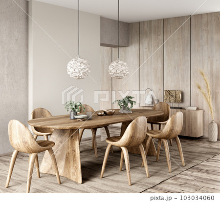 Interior design of modern dining room, dining table and wooden chairs. 3d rendering
