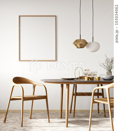 Interior of modern dining room, dining table and chairs against white wall with empty frame. 3d rendering