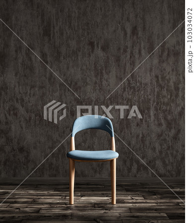 Blue fabric dining chair against dark stucco wall. 3d rendering