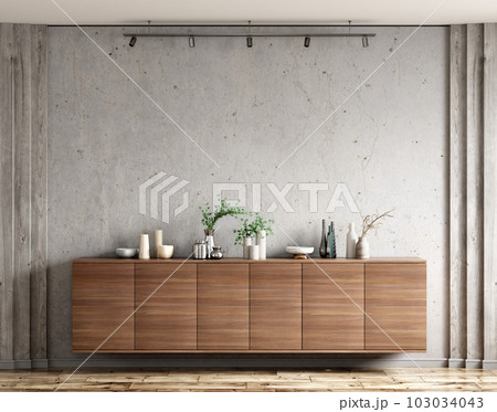 Wooden sideboard in modern living room, concrete wall with wooden paneling, home interior background with copy space, 3d rendering