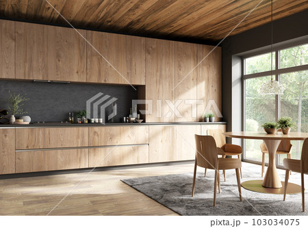 Modern interior design of wooden kitchen with round dining table and chairs near window, dining table and chairs. 3d rendering.